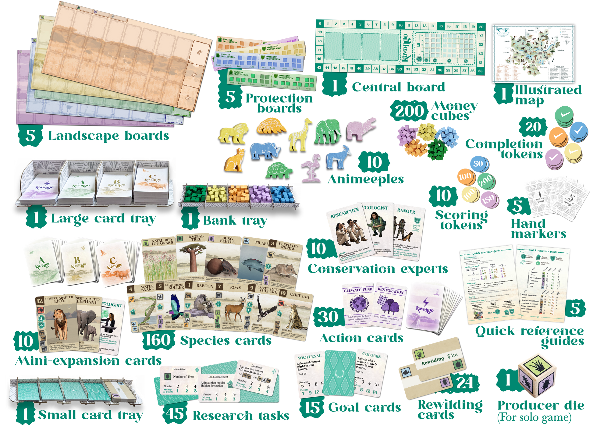 Created by Matt and Zara, while working on conservation in Botswana, Kavango is deeply thematic and is thoughtfully designed to be a modern and realistic view of conservation in southern Africa. With 160 beautifully unique species cards, 45 research cards, 10 conservation experts and 5 landscape boards, there is huge variability to reflect the incredible biodiversity of Kavango.